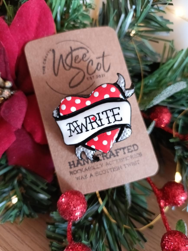 This wee 4 x 4.5cm polymer clay brooch is hand crafted, painted in acrylic and then Varnished to help with wear. Finished with a silver plated brooch back.