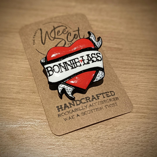 This wee 4 x 4.5cm polymer clay brooch is hand crafted, painted in acrylic and then Varnished to help with wear. Finished with a silver plated brooch back.