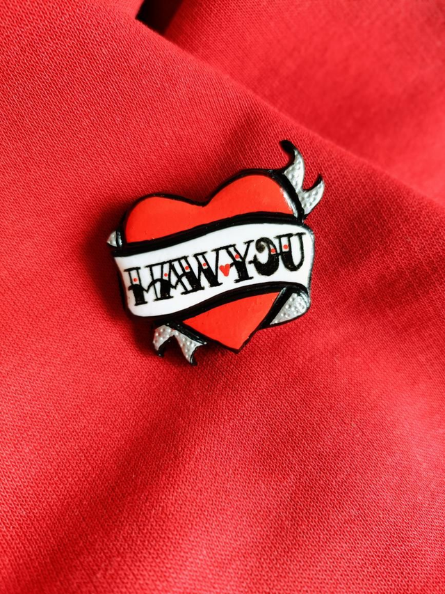This wee 4 x 4.5cm polymer clay brooch is hand crafted, painted in acrylic and then Varnished to help with wear. Finished with a silver plated brooch back.