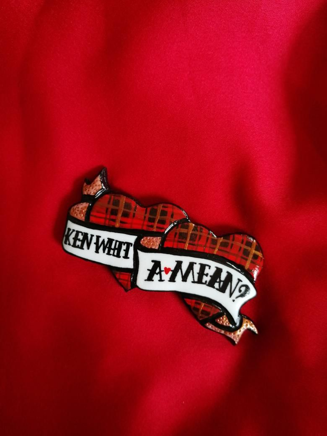 This double heart piece of braw banter is made by hand from polymer clay about 7cm in lenght and painted with a stainless steel brooch back. Varnished to help protect in wear and made to order.