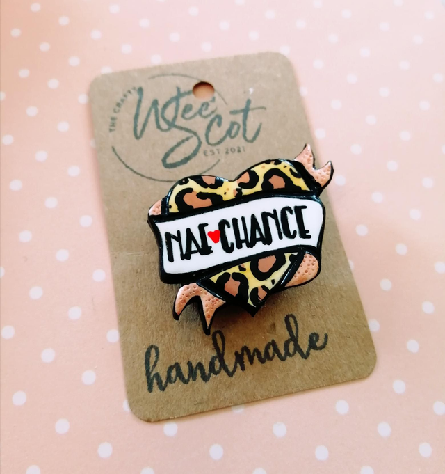 This wee 4 x 4.5cm polymer clay brooch is hand crafted, painted in acrylic and then Varnished to help with wear. Finished with a silver plated brooch back.