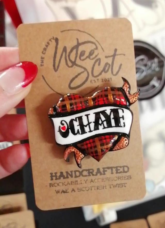 This wee 4 x 4.5cm polymer clay brooch is hand crafted, painted in acrylic and then Varnished to help with wear. Finished with a silver plated brooch back.