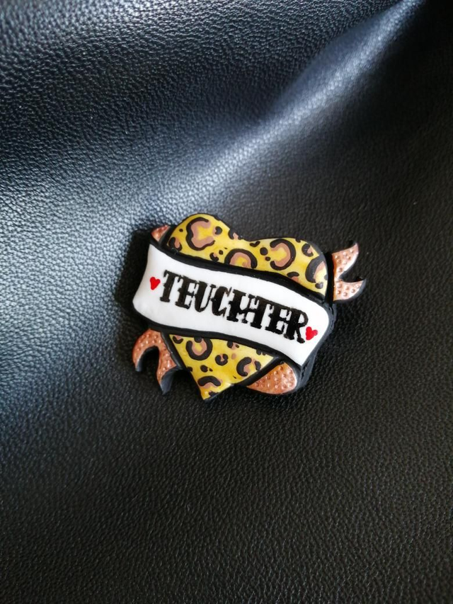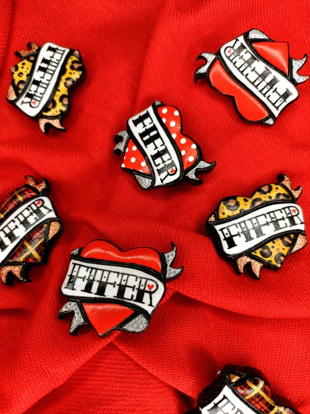 This wee 4 x 4.5cm (ribbon 5 cm x 4.5cm) polymer clay brooch is hand crafted, painted in acrylic and then Varnished to help with wear. Finished with a silver plated brooch back.